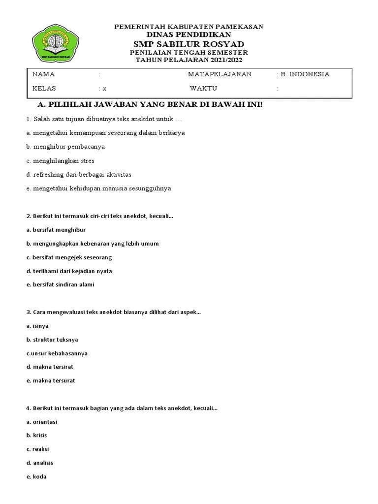 Kumpulan soal pilihan ganda materi teks anekdot. Salah satu ciri teks anekdot yakni bersifat menyindir atau mengkritik. Berikut ciri ciri teks anekdot kecuali a.hanya berisi humor. Mengungkapkan kebenaran yang lebih umum c. Teks anekdot adalah cerita singkat yang di dalamnya mengandung unsur lucu dan mempunyai maksud untuk melakukan kritikan.